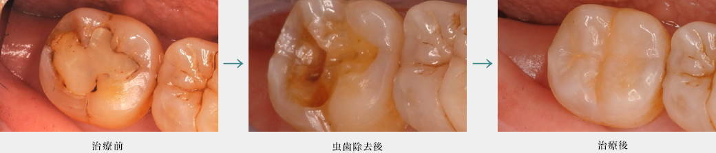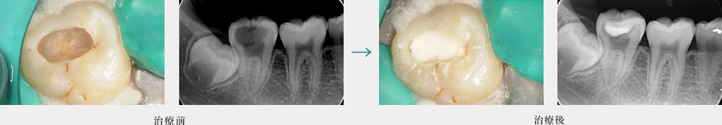 神経(歯髄)まで達する虫歯でしたが、洗浄し薬剤で封鎖することで神経を取ることなく、治療を終えています。