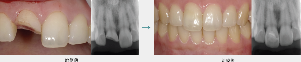 神経(歯髄)に達する歯の破折でしたが、神経の温存を行い破折してしまった欠片を接着しています。