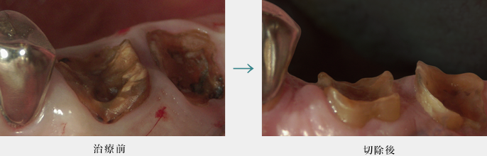 差し歯の中で虫歯が生じ、歯茎の深部まで虫歯が進行していました。