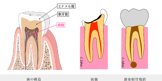 虫歯などの原因により、細菌が歯髄まで及び、痛みが出ると歯髄を取らなくてはならない場合があります。(抜髄)