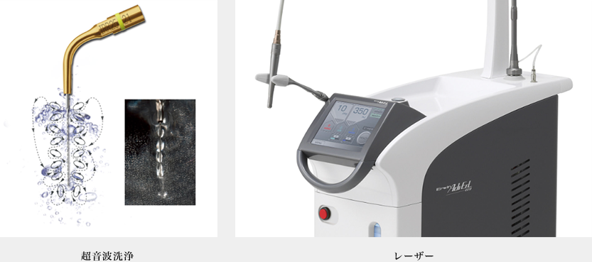 根管治療において根管内の洗浄は非常に重要です。当院では、化学的洗浄法として、超音波による洗浄だけでなく、エルビウムヤグレーザーによる洗浄も併用しております。徹底的な洗浄時間を確保することで高い成功率が保たれております。