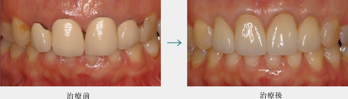 外科的に歯ぐきのラインのバランスを審美的に整えたのち、セラミックにて修復しています。